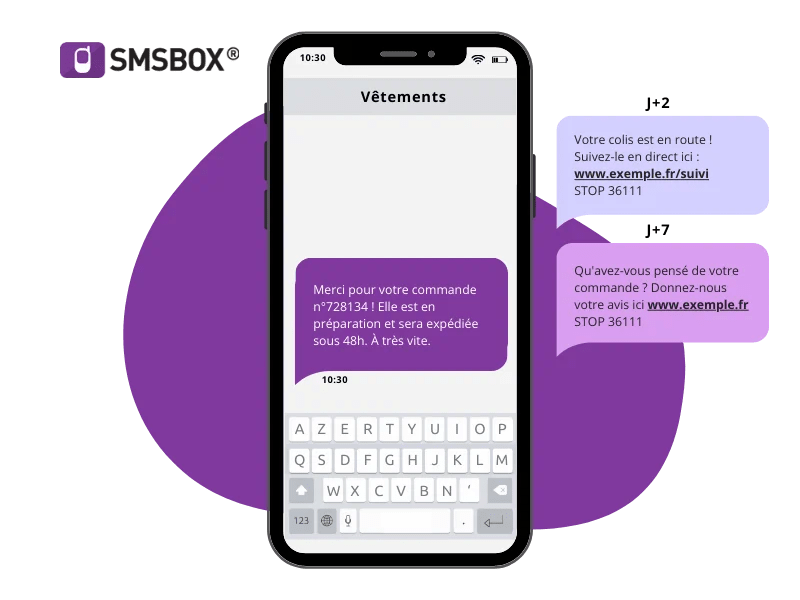 - Demande d’avis (J+7) : « Qu'avez-vous pensé de votre commande ? Donnez-nous votre avis en 30 secondes www.exemple.fr/avis STOP au 36111 »
