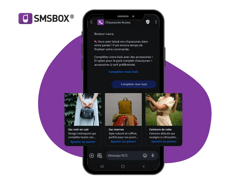 Un client a ajouté une paire de chaussures à son panier, mais n’a pas finalisé son achat. Quelques heures plus tard, il reçoit un message RCS lui rappelant son panier oublié. Le message intègre un carrousel mettant en avant une ceinture assortie et un sac coordonné, chacun accompagné d’un bouton « Ajouter au panier ». Plus bas, un bouton « Valider mon panier avec le pack complet » propose une offre groupée à tarif préférentiel.