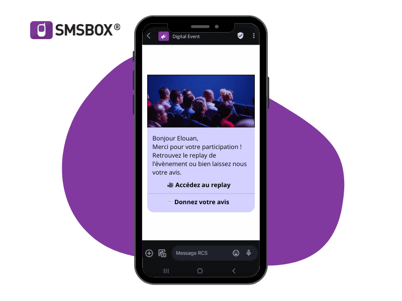 Le RCS permet d’enrichir ce message. Galerie photos, replay d’une conférence, temps forts de la journée : les contenus sont accessibles directement depuis le message. Des boutons dédiés orientent vers un questionnaire de satisfaction.